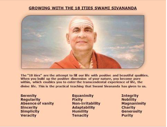 Les 18 "ities" sont une attentive de remplir notre vie avec des qualités positives et de belles qualités. Aussitôt que tu construit la dimension positive de ta nature, tu deviens pure à l'intérieur, ceux qui te permets d'entrer dans l'expérience transcendantale de la vie, la vie divine. Ceux-ci est l'enseignement pratique Swami Sivananda nous a donné.